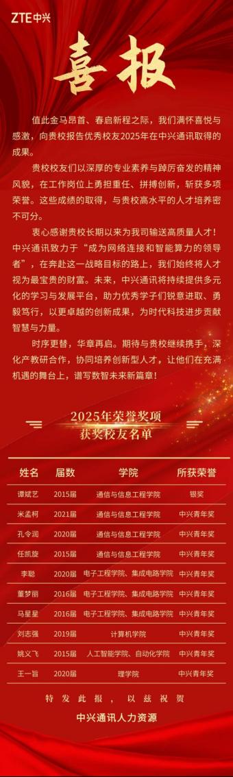 近日,中兴通讯股份有限公司向我校发来喜报。我校10名毕业生荣获中兴通讯2025年度荣誉奖励,其中电子工程学院、集成电路学院有3名毕业生荣获奖励,中兴通讯对学校长期以来为公司输送高质量人才表示感谢。